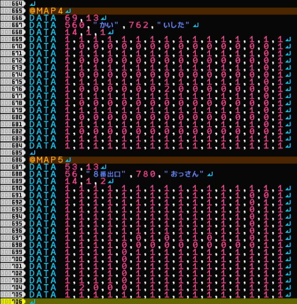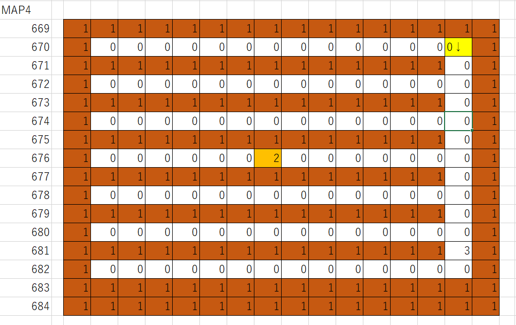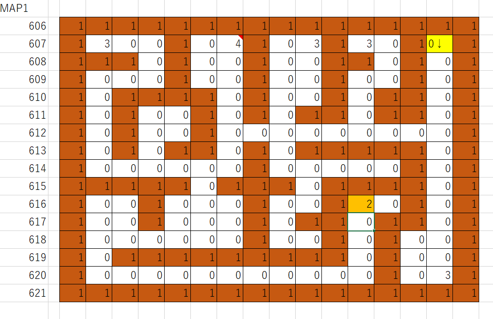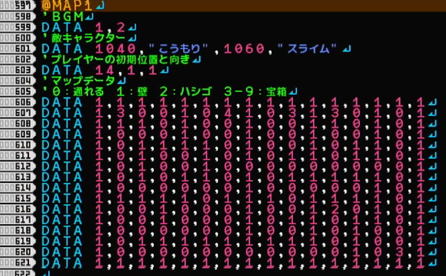 606行から621行はマップのデータです。0は空間、1は壁、2はゴールであるハシゴ、3は薬草の宝箱、4以降は武器の宝箱です。