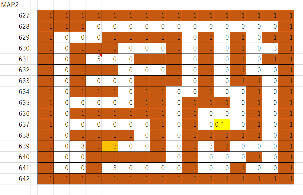 603行目の最初のデータはスタート位置のヨコの位置、2番目のデータはタテの位置、3番目のデータは「向き」です。「向き」とは、マップの上方向を北とした場合には、0は東、1は南、2は西、3は北を示します。