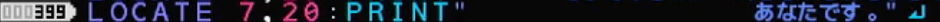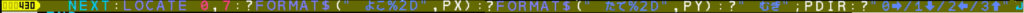 NEXT:LOCATE 0,7😕FORMAT$(“ よこ%2D“,PX) 😕FORMAT$(“ たて%2D“,PY):?” むき“;PDIR:?”0→/1↓/2←/3↑“