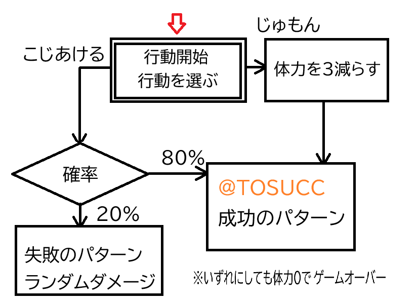 プログラムの329行から、呪文で宝箱を開けた場合と、こじ開けるた場合のそれぞれの管理が記述されています。