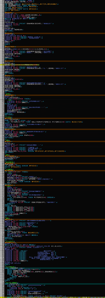 次に、TOPMENU>作品を見る>サンプル>からGAME_RPG.PRGを実行して、+キーで中断すると、実行後、エディットモード(ダイレクトモードからXボタン)でプログラムの中身を確認できます。好きな名前でSAVEしてください。(例:SAVE“GAME_RPG2”)